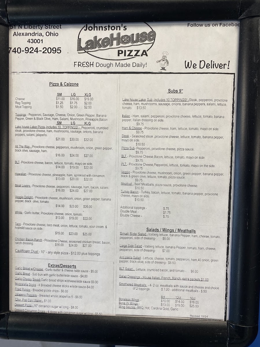 Johnstons Lakehouse Pizza offers a satisfying selection of dishes that cater to various tastes. For pizza lovers, the menu features classics like the Cheese Pizza and the more adventurous Lake House Laker Pizza and All The Way BLT pizza, alongside the crowd-pleasing Hawaiian Pizza. If you're in the mood for something hearty, their calzones are also a great choice. On the side, you can enjoy delicious Garlic Bread W/Cheese for $3.99 or Garlic Cheesy Bread for $4.99, perfect for sharing. For a snack or appetizer, options like Mozzarella Sticks and Fried Pickles offer a savory bite. If subs are more your style, there's the signature Lake House Laker Sub and the flavorful Italian Sub. For a heartier option, you can also try the Ham & Cheese Steak or the Pizza Sub, each brimming with taste. Their salads provide lighter alternatives, with choices like the Small Side Salad for $2.99 or a more substantial Anti Pasta Salad for $6.99. The Blt Salad offers a refreshing twist, while the Smothered Meatballs add a rich, savory touch to the menu. For those craving wings, Boneless Wings and Bone In Wings round out the options for a satisfying meal. Whether you're in the mood for pizza, subs, or a comforting side dish, Johnstons Lakehouse Pizza has something to satisfy every craving.